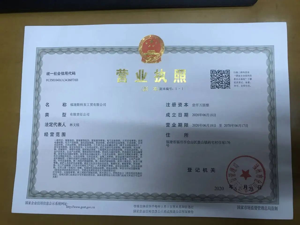 Registered address : No. 176, Shiwei, Yuzhai Village, Gaishan Town, Cangshan District Fuzhou Fujian China